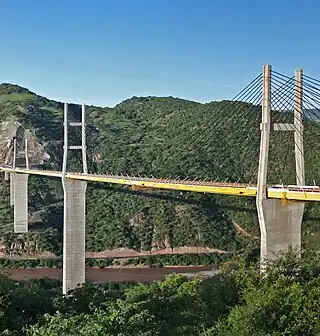 El concepto innovador de este puente, con cuatro tramos adyacentes principales sufridas por tres arpas consecutivos de estancias (con tres torres altas y con la torre central es el pilón central principal (muelle) de 173 m (568 pies) de altura, fue diseñado por el ingeniero nicaragüense Modesto Armijo, director de la empresa mexicana "COMEC SA", para la cuenta de la Agencia de la Secretaría de Comunicaciones y Transportes (Secretaría de Comunicaciones y Transportes). El diseño detallado también se logró por Modesto Armijo y Chauvin Alain de "COMEC, SA ". Mientras COMEC hizo el diseño de ingeniería estructural, los diseños de ingeniería fueron verificados por EEG Gecti Estudios Europa y los cables han sido facilitadas por Freyssinet Internacional.[3][7]