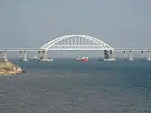 El 8 de octubre de 2022, una gran explosión en la calzada entre Rusia y Crimea provocó grandes daños en el puente, incluyendo el colapso de un tramo de su tablero.[7][8]