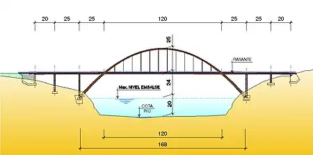 La estructura es un puente arco con tablero intermedio de 168 m de luz, con vanos de aproximación, ajustada a la forma natural del valle y la anchura del embalse en ese punto. La cimentación de los arcos se realiza sobre roca caliza en ambas laderas, cerca de la cota de máximo nivel de embalse.