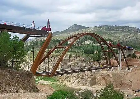 Se realizó una plataforma temporal de trabajo en el lecho del embalse donde se montaron apeados los 120 m centrales del tablero metálico. Posteriormente, se establecieron una serie de torres de cimbra coincidentes con la posición de las péndolas. Cada semi-arco fue dividido en 3 tramos de transporte, se colocaron en posición apoyados en las torres, y se unieron entre sí y al tablero en sus extremos. Se desapearon los arcos ya unidos de las torres, se colocaron las péndolas, y se elevó con gatos los extremos del tablero, desapeando las vigas del tablero de sus apoyos intermedios y cargando el arco atirantado (bowstring).