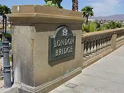 El puente de Londres es una estructura situada actualmente en Lake Havasu City, Arizona, Estados Unidos. Con 280 metros de largo,[3] este puente en arco fue inaugurado originalmente en 1831 y anteriormente se extendía sobre el río Támesis en Londres, Inglaterra, Reino Unido. En 1968, Robert P. McCulloch compró el puente a la alcaldía de Londres. McCulloch hizo cortar los bloques de granito exteriores del puente original y transportarlos a los Estados Unidos para usarlos en la construcción de un nuevo puente en Lake Havasu City, una comunidad planificada que se estableció en 1964 en la orilla del lago Havasu. El puente se completó en 1971 (junto con un canal) y une una isla en el río Colorado con la parte principal de Lake Havasu City. Es una estructura de hormigón armado revestida con la mampostería original del puente de la década de 1830.