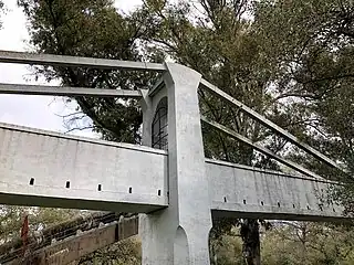 Para el paso se diseña una estructura de 14 pilas,[4] con luces biapoyadas de 30 metros. Dos de estos pilares se asentaban en el cauce, por lo que se dudó que la estructura pudiera resistir los embates del río en caso de inundación. Es por ello que Eduardo Torroja, el encargado de diseñar la obra, decide sustituir los dos pilares por un vano central con dos ménsulas de 20 metros y un tramo central de 17 metros. Para soportar las ménsulas se extienden tirantes de acero de 63 mm de diámetro que se apoyan sobre las pilastras. Para tensar el cable se elevó la sección superior de la pilastra con gatos,[5] provocando la reacción vertical necesaria para poner en tensión los tirantes y dejar el puente en carga. El mismo Torroja cuenta que al poco de hormigonar la estructura, el agua empezó a subir en el cauce amenazando la integridad de la estructura. Cuando se consideró que el hormigón había alcanzado la suficiente resistencia se accionaron los gatos, elevando la estructura unos 25 cm y elevando el vano 5 cm. La cimbra finalmente se la llevaría el agua, pero pudo terminarse el puente a tiempo. El puente quedó finalizado en enero de 1927.