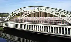 ![]() Acueducto de Stanley Ferry, Yorkshire, inaugurado en 1839, construido con fundición de hierro: un arco de tablero pasante propiamente dicho (pero no un arco atirantado) |