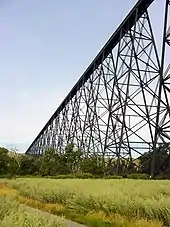 - Puentes de caballetes: tienen su origen en los puentes de madera empleados en los primeros tiempos del ferrocarril en los Estados Unidos para cruzar valles cerrados y profundos, en los que se empleaban entramados continuos para salvar la vaguada. Con posterioridad, se pasó de la disposición de cimbra cuajada a la de sucesivos apoyos muy próximos entre sí. En la práctica, un puente de caballetes, salvo que se trate de un entramado continuo, no es muy diferente a cualquier otro tipo de puente de vigas. Un ejemplo notable es el viaducto de Leth,[25] un puente de caballetes de 1624 m de longitud total inaugurado en Canadá en 1909. Se trata de una tipología que ha dejado de emplearse con posterioridad, por la elevada repercusión del coste de los apoyos en el coste total de la estructura.