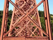 Las uniones remachadas eran el tipo de conexión más común antes de que la soldadura se generalizara. Los puentes rectos con vigas de celosía del siglo XIX y de comienzos del siglo XX estaban remachados. La foto de al lado muestra un detalle del ensamblaje clásico de estas celosías mediante roblones. Los montantes verticales y horizontales están compuestos por perfiles angulares y planchas planas remachados entre sí. Los montantes inclinados están confeccionados a base de barras en forma de U. En la unión de cada conjunto, se agregan placas, llamadas cartelas y cubrejuntas, para dar rigidez a los nudos de la estructura.