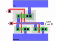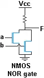 Los diagramas anteriores muestran la construcción de una puerta NOR de 2 entradas utilizando circuitería lógica NMOS. Si cualquiera de las entradas son altas, se enciende la correspondiente MOSFET de N canales y la salida se tira hacia abajo; de lo contrario la salida se tira a alto y al resistor pull-up.