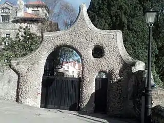 La puerta, de estilo modernista, consta de tres vanos: el mayor es para la entrada de carruajes; el mediano daba paso a las personas; y el circular, colocado encima de la anterior, según leyenda de su creador, para las aves.