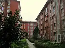 Con motivo de solucionar el grave déficit de viviendas que había en Gijón durante la posguerra,[4] en 1958 el Instituto Nacional de la Vivienda comenzó a levantar 1.500 viviendas en Pumarín. El grupo entonces proyectado, que originalmente se llamaba «Ciudad Satélite de Pumarín», dio lugar a lo que hoy se conoce como «Las Mil Quinientas». Este conjunto ocupa una superficie de 12 hectáreas en un lugar que en aquel momento estaba verdaderamente alejado del centro urbano, pero situado junto a la carretera a Oviedo —actual avenida de la Constitución— y cerca de la carretera Carbonera —actualmente integrada en la avenida Schulz—. Incorpora lo que para la época fueron grandes novedades. En efecto, las viviendas están distribuidas en 68 bloques aislados de diferentes alturas entre los que hay jardines públicos, muchos edificios ya contaban ascensor cuando se construyeron y entre ellos hay uno que tiene 20 pisos.[3] Detrás de estas innovaciones, que se pueden inscribir dentro del movimiento moderno, estaba un equipo de profesionales propuesto por el Ayuntamiento. Lo lideraba el arquitecto municipal, José Avelino Díaz Fernández-Omaña, e incluía a Juan Manuel del Busto González, José Antonio Muñiz Muñiz y Miguel Díaz Negrete.[5]