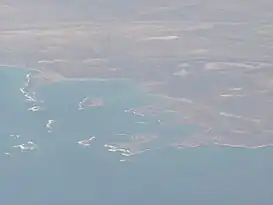 Vista aérea de la punta Ezquerra (izquierda) y sus alrededores desde un Embraer 190 de Austral Líneas Aéreas (ver en detalle en Commons).