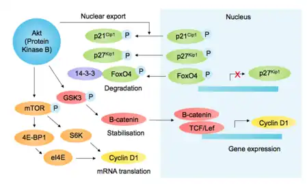 p85, otra proteína que contiene el dominio SH2, se une a las RTK activadas y recluta PI3K (fosfoinositido-3-quinasa), fosforilando el fosfolípido PIP2 a PIP3, lo que lleva al reclutamiento de Akt (a través de su dominio PH). Además de otras funciones pro-crecimiento y pro-supervivencia, Akt inhibe la glucógeno sintasa quinasa-3β (GSK3β), previniendo así la fosforilación mediada por GSK3β y la posterior degradación de la ciclina D1[9] ( ver figura [10] ). Akt además regula los componentes G1/S mediante la promoción mediada por mTOR de la traducción de ciclina D1,[11] fosforilación de los inhibidores de Cdk p27 kip1 (evitando su importación nuclear) y p21 Cip1 (estabilidad decreciente), e inactivando la fosforilación del factor de transcripción FOXO4 (que regula la expresión de p27).[12] En conjunto, esta estabilización de la ciclina D1 y la desestabilización de los inhibidores de Cdk favorecen la actividad de G1 y G1/S-Cdk.