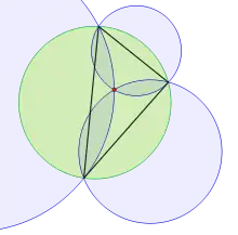Además de ser las intersecciones de los círculos de Apolonio, cada punto isodinámico es el punto de intersección de otra terna de circunferencias. El primer punto isodinámico es la intersección de tres circunferencias a través de los pares de puntos y donde cada una de estas circunferencias cruza la circunferencia circunscrita del triángulo para formar una figura con forma de lente con un ángulo de vértice de 2π/3. De manera similar, el segundo punto isodinámico es la intersección de tres circunferencias que intersecan la circunferencia circunscrita para formar lentes con un ángulo de vértice π/3.[6]