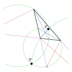 Otra construcción con compás y regla implica encontrar la reflexión del vértice respecto a la línea (la intersección de circunferencias centradas en y hasta ), y construir un triángulo equilátero hacia adentro en el lado del triángulo (el vértice de este triángulo es la intersección de dos circunferencias que tienen como radio ). La recta cruza las rectas y construidas de manera similar en el primer punto isodinámico. El segundo punto isodinámico puede construirse de manera similar, pero con los triángulos equiláteros erigidos hacia afuera y no hacia adentro.[12]