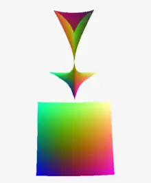 Las clases de equivalencia de tales cúbicas bajo escala uniforme forman un espacio proyectivo real tridimensional y el subconjunto de formas parabólicas definen una superficie, llamada brazalete umbilical por Christopher Zeeman.[4] Al tomar clases de equivalencia bajo la rotación del sistema de coordenadas se elimina un parámetro adicional y las formas cúbicas se pueden representar mediante la forma cúbica compleja con un único parámetro complejo . Se generan formas parabólicas cuando , el deltoide interior, de forma que las formas elípticas quedan dentro del deltoide y las hiperbólicas fuera. Si y no son una raíz cúbica de la unidad, entonces la forma cúbica es una forma cúbica en ángulo recto que desempeña un papel especial para los puntos umbilicales. Si entonces dos de las líneas raíz son ortogonales.[5]