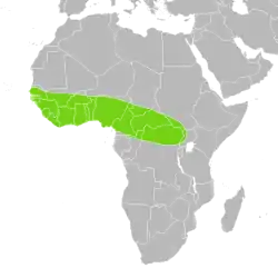 Su área de distribución la encontramos en el continente africano, en África central occidental y sur occidental, más concretamente en los países de Senegal, Gambia, Guinea, Malí, Sierra Leona, Liberia, Costa de Marfil, Burkina Faso, Ghana, Togo, Benín, Nigeria, Chad, Camerún, República Centroafricana, Sudán, Congo, Zaire, Uganda y Angola. Estas regiones, no tienen las mismas características climatológicas, por tanto se pueden diferenciar de mayor predominancia a menor, como, clima húmedo tropical de la sabana con unas temperaturas medias anuales entre 23° y 30 °C, con una humedad entre el 60 % y el 70%, lluvias entre otoño y primavera; clima húmedo tropical de selva, entre 25º y 30 °C de temperatura, 70-80 % de humedad, lluvias abundantes durante todo el año; clima árido estepario, temperaturas entre 0° y 20 °C, 50 % de humedad, lluvias escasas; clima húmedo tropical monzónico, temperaturas entre 23° y 32 °C, 60-70 % de humedad, lluvias escasas; clima húmedo templado cálido, temperaturas entre 12° y 29 °C, 70 % de humedad, abundantes lluvias en primavera y verano.
