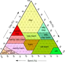 La textura del suelo influye en la química del suelo relacionada con la capacidad del suelo para mantener su estructura, la restricción del flujo de agua y el contenido de las partículas en el suelo. La textura del suelo considera todos los tipos de partículas y un triángulo de textura del suelo es una tabla que se puede usar para calcular los porcentajes de cada tipo de partícula sumando un total del 100% para el perfil del suelo. Estos suelos separados difieren no solo en su tamaño, sino también en su relación con algunos de los factores importantes que afectan el crecimiento de las plantas, como la aireación del suelo, la capacidad de trabajo, el movimiento y la disponibilidad de agua y nutrientes. Un suelo nunca está compuesto de una sola fracción, sino que suele tener pequeñas fracciones de la mayoría de texturas.