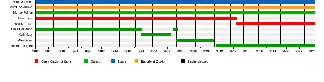 - Geoff Tate – chant lead, claviers, saxophone (1982-2012)