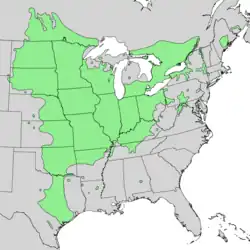 Se reproduce al oeste sobre los Montes Apalaches hasta el centro de las Grandes Llanuras, donde se extiende hasta el centro de Texas, y al sur a través de Manitoba, Ontario y Quebec, sobre la costa del Océano Atlántico en la costa desde Nuevo Brunswick hasta Delaware. El Roble Bur es el árbol del estado de Iowa.