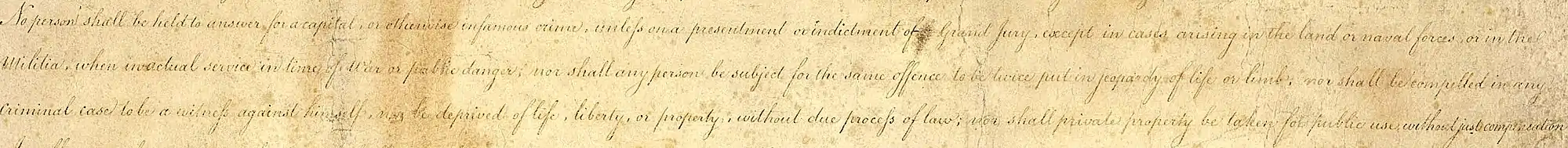 Una de las disposiciones de la Quinta Enmienda exige que los delitos graves sólo se juzguen previa acusación de un gran jurado, aunque, al no haber sido incorporada, solo aplica al Circuito Federal.[2] Otra disposición, la Cláusula de Doble Riesgo, establece el derecho de los acusados a ser juzgados una sola vez en un tribunal federal por el mismo delito.[3] La cláusula de autoinculpación ofrece varias protecciones contra la autoinculpación, incluido el derecho de una persona a no servir como testigo en un caso penal en el que sea el acusado. "Declarar la Quinta" es un término coloquial que se utiliza a menudo para invocar la cláusula de autoincriminación cuando los testigos se niegan a responder a las preguntas cuando las respuestas podrían incriminarlos. En el caso Miranda contra Arizona, de 1966, el Tribunal Supremo sostuvo que la cláusula de autoincriminación exige que la policía emita una advertencia Miranda a los sospechosos de delitos interrogados mientras están bajo custodia policial.[4] La Quinta Enmienda también contiene la Cláusula de Expropiación, que permite al gobierno federal tomar una propiedad privada para uso público si el gobierno proporciona una "compensación justa".[5]
