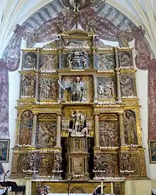 En la[6] a ambos lados del sagrario se puede observar la representación de los Evangelistas. Las figuras de San Marcos y San Juan flanqueando una escena de Jesús orando en el monte de los olivos (izquierda) y las figuras de San Lucas y San Mateo flanqueando la escena de la captura de Jesús (derecha). En el primer cuerpo, sobre el Sagrario destaca una escultura de San Miguel Arcángel triunfando sobre el Demonio que tiene a cada lado escenas del Calvario (izquierda) y el juicio de Jesús (derecha). El primer cuerpo está enmarcado por las figura de San Pablo y San Pedro. Pasando al segundo cuerpo encontramos la figura central de San Román Mártir en la calle central que tiene a ambos lados escenas del Bautismo de Jesús (izquierda) y Salomé pidiendo la cabeza de San Juan Bautista (derecha). Sobre San Román Mártir encontramos la representación de la Ascensión que divide una representación de la Anunciación a la Virgen (tercer cuerpo). En estos dos últimos cuerpos aparecen los Apóstoles enmarcando el retablo. Terminando, en el ático, se encuentra una alegoría a la Pasión. Coronando todo el conjunto una cruz flanqueada por una escultura de la Virgen y San Juan.