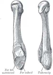 La base es la parte más cercana al tobillo y la cabeza es la más cercana a los dedos del pie. La parte estrecha del centro se denomina cuerpo (o eje) del hueso. El hueso es algo plano, por lo que tiene dos superficies: la plantar (hacia la planta del pie) y la dorsal (la zona que mira hacia arriba al estar de pie).[1] Estas superficies son rugosas para la fijación de los ligamentos. El hueso está curvado longitudinalmente, de modo que es cóncavo por debajo y ligeramente convexo por encima.
