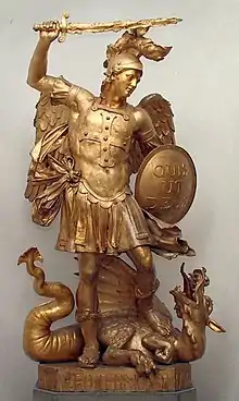 La escena de la lucha entre Miguel y el diablo, relatada en el Libro del Apocalipsis (capítulos 12:7[9] y 20:2[9]) es un tema recurrente en la historia del arte y ha sido recreado por pintores como Rafael Sanzio, Rubens o Luca Giordano.
