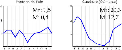Los valores bajos indican un régimen constante y los altos grandes irregularidades. Existe una correspondencia directa entre la aridez del clima y la irregularidad del régimen fluvial: los ríos de las zonas de clima ecuatorial presentan un caudal abundante y una oscilación del régimen relativamente escasa. Por el contrario, en los ríos de las regiones de clima árido, las fluctuaciones del caudal de los ríos son muy grandes y violentas. En España, por ejemplo, el río Miño tiene un régimen casi como Gena, con caudal abundante y escasa variaciones. En cambio, el Júcar, con una cuenca ubicada en un clima más árido, presenta mayores irregularidades: de hecho, es el río con el máximo caudal alcanzado en toda la península ibérica aunque en promedio tiene un caudal muy inferior al del Miño.