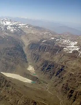 ![]() Confluencia del Blanco y el río Los Leones. El Cerro El Plomo es visible arriba a la izquierda y el Embalse Los Leones se ve en la parte de abajo de la foto. | ||
