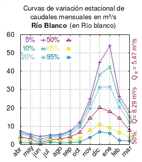 El caudal del río (en un lugar fijo) varía en el tiempo, por lo que existen varias formas de representarlo. Una de ellas son las curvas de variación estacional que, tras largos periodos de mediciones, predicen estadísticamente el caudal mínimo que lleva el río con una probabilidad dada, llamada probabilidad de excedencia. La curva de color rojo ocre (con ) muestra los caudales mensuales con probabilidad de excedencia de un 50%. Esto quiere decir que ese mes se han medido igual cantidad de caudales mayores que caudales menores a esa cantidad. Eso es la mediana (estadística), que se denota Qe, de la serie de caudales de ese mes. La media (estadística) es el promedio matemático de los caudales de ese mes y se denota .