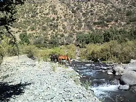 En su recorrido aguas abajo cruzó antiguamente la comuna de Colina antes de desembocar en el estero Lampa. Hoy su cauce es desviado para entregar agua a la minera Las Tórtolas propiedad de Anglo American y a la asociación de canalistas de Colina que la utilizan para regar predios colindantes dejando sin agua el río desde Peldehue al sur de Colina. Los derechos de aprovechamiento de agua los administra una división del ejército chileno llamado comando de bienestar del ejército quién lo arrienda a los canalistas anteriormente mencionados y a agroindustrial Chacabuco mediante el arriendo de un predio que se irriga con dicho río y derechos de aprovechamiento restantes.[cita requerida]