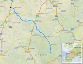 Recorre los departamentos de Creuse e Indre, y forma parte del límite entre Vienne e Indre y Loira. Las principales ciudades que atraviesa son Aubusson, Crozant, Argenton-sur-Creuse, Le Blanc, Yzeures-sur-Creuse, La Roche-Posay y Descartes.