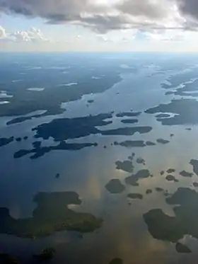 ![]() Vista aérea del lago Minnitaki, que es atravesado por el río English en su curso medio | ||