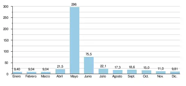 El caudal mensual medio observado en febrero y en marzo (mínimo de estiaje) es de 9,04 m³/s, que es un poco más del caudal medio del mes de mayo, máximo del año, que alcanza los 296 m³/s), lo que muestra la elevada importancia de las variaciones estacionales. En los 49 años del estudio, el caudal mensual mínimo fue de 5,19 m³/s en diciembre de 1970, mientras que el caudal medio mensual se elevó a 637 m³/s en mayo de 1999.