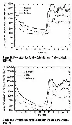 El río Kobuk está cubierto de hielo durante un promedio de seis meses al año[12] y, en general, desde finales de octubre hasta finales de mayo es un período de caudal relativamente bajo.[2] Anualmente, el hidrograma refleja dos picos de inundación: el primero está asociado con la interrupción de la primavera y el segundo, un pico menor, está asociado con las precipitaciones de finales del verano.[12] A medida que la capa de nieve comienza a derretirse a finales de mayo, el caudal del río Kobuk aumenta y la mayor parte de la escorrentía se produce durante junio. El flujo durante el verano (julio a septiembre) está dominado por eventos de precipitación variables.[2]