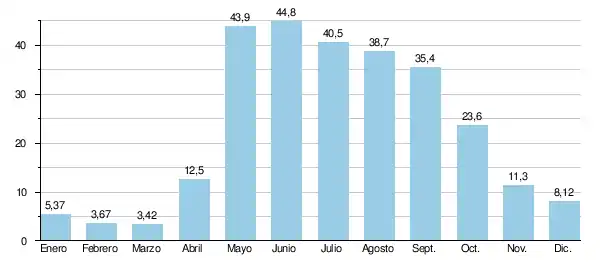 El caudal medio mensual observado en marzo (mínimo de estiaje) es de 3.42 m³/s, más del 7% del caudal emdio del mes de mayo (44,8 m³/s), lo que subraya la amplitud bastante moderada de las variaciones estacionales. Estas diferencias de caudal pueden ser más marcadas a lo largo de los años: en los 52 años del periodo de observación, el caudal mensual mínimo se dio en febrero de 1979 (0,61 m³/s), mientras que el máximo se dio en junio de 1985 (137 m³/s).