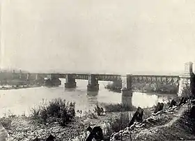 ![]() Fotografía ca. 1900 del puente ferroviario n° 1 sobre el río Lircay, proyectado por Domingo V. Santa María y construido por Lever, Murphy y Cía, en 1885. | ||