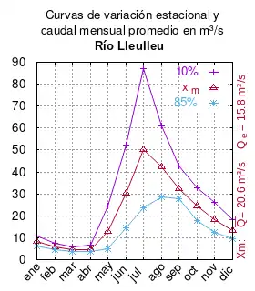 El caudal del río (en un lugar fijo) varía en el tiempo, por lo que existen varias formas de representarlo. Una de ellas son las curvas de variación estacional que, tras largos periodos de mediciones, predicen estadísticamente el caudal mínimo que lleva el río con una probabilidad dada, llamada probabilidad de excedencia. La curva de color rojo ocre (con ) muestra los caudales mensuales con probabilidad de excedencia de un 50%. Esto quiere decir que ese mes se han medido igual cantidad de caudales mayores que caudales menores a esa cantidad. Eso es la mediana (estadística), que se denota Qe, de la serie de caudales de ese mes. La media (estadística) es el promedio matemático de los caudales de ese mes y se denota .