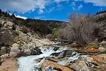 En su primer tramo, el río fluye en sentido noroeste-sureste y discurre sobre un cauce estrecho y superficial, flanqueado por berrocales. Cuando alcanza los 1300 m de altitud toma rumbo este, pero enseguida recupera la dirección sureste, poco antes de entrar en la garganta de la Camorza. En este punto vuelve a encajonarse entre formaciones rocosas de grandes proporciones, labrando sobre la piedra numerosas pozas y hoyas, que salva mediante cascadas y charcas.