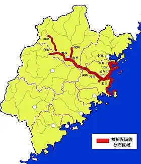 La capital provincial, Fuzhou, se sitúa en la parte baja del río. El centro histórico está en el lado norte mientras el suburbio de Changle está en el otro lado. La ciudad es un importante puerto.