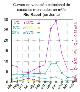 El caudal del río (en un lugar fijo) varía en el tiempo, por lo que existen varias formas de representarlo. Una de ellas son las curvas de variación estacional que, tras largos periodos de mediciones, predicen estadísticamente el caudal mínimo que lleva el río con una probabilidad dada, llamada probabilidad de excedencia. La curva de color rojo ocre (con ) muestra los caudales mensuales con probabilidad de excedencia de un 50%. Esto quiere decir que ese mes se han medido igual cantidad de caudales mayores que caudales menores a esa cantidad. Eso es la mediana (estadística), que se denota Qe, de la serie de caudales de ese mes. La media (estadística) es el promedio matemático de los caudales de ese mes y se denota .