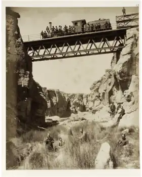 ![]() Retrato de un grupo de personas posando frente al puente ferroviario sobre el río San Pedro. Se ve un tren de calichero y personas mirando desde el puente. | ||