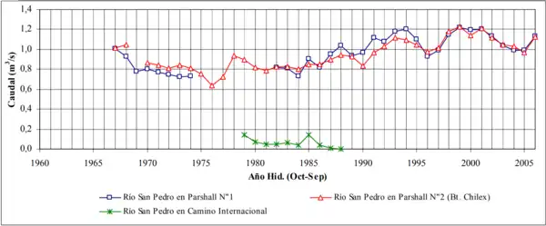 ![]() Variaciones del caudal medio anual del río en Parshall No 1 a través de los años en tres lugares diferentes. |
