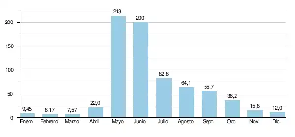 Durante los 29 años del estudio, el caudal mensual mínimo fue de 1.60 m³/s en febrero de 1969, mientras que el caudal mensual se elevó a 514 m³/s en junio de 1966.