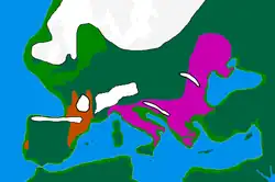 En el apogeo de la última edad del hielo, alrededor del año 20.000 a. C., Gran Bretaña estaba conectada con el continente europeo por una gran extensión de tierra conocida como Doggerland, localizada en el sur del mar del Norte. En ese momento, el curso del Támesis no continuaba hacia Doggerland, sino que fluía hacia el sur desde la costa este de Essex, donde se encontraba con las aguas del proto-delta del Rin-Mosa-Escalda[42] un conjunto de ríos que fluía desde lo que ahora son los Países Bajos y Bélgica. Estos ríos formaban un solo río, el río del Canal (Fleuve Manche), que atravesaba el estrecho de Dover y desembocaba en el océano Atlántico, en lo que es hoy el Canal de la Mancha occidental.