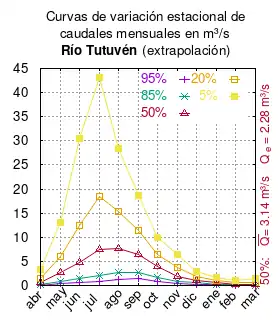 El caudal del río (en un lugar fijo) varía en el tiempo, por lo que existen varias formas de representarlo. Una de ellas son las curvas de variación estacional que, tras largos periodos de mediciones, predicen estadísticamente el caudal mínimo que lleva el río con una probabilidad dada, llamada probabilidad de excedencia. La curva de color rojo ocre (con ) muestra los caudales mensuales con probabilidad de excedencia de un 50%. Esto quiere decir que ese mes se han medido igual cantidad de caudales mayores que caudales menores a esa cantidad. Eso es la mediana (estadística), que se denota Qe, de la serie de caudales de ese mes. La media (estadística) es el promedio matemático de los caudales de ese mes y se denota .