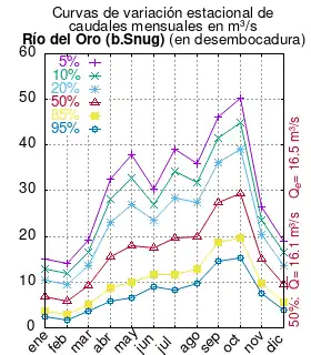 El caudal del río (en un lugar fijo) varía en el tiempo, por lo que existen varias formas de representarlo. Una de ellas son las curvas de variación estacional que, tras largos periodos de mediciones, predicen estadísticamente el caudal mínimo que lleva el río con una probabilidad dada, llamada probabilidad de excedencia. La curva de color rojo ocre (con ) muestra los caudales mensuales con probabilidad de excedencia de un 50%. Esto quiere decir que ese mes se han medido igual cantidad de caudales mayores que caudales menores a esa cantidad. Eso es la mediana (estadística), que se denota Qe, de la serie de caudales de ese mes. La media (estadística) es el promedio matemático de los caudales de ese mes y se denota .