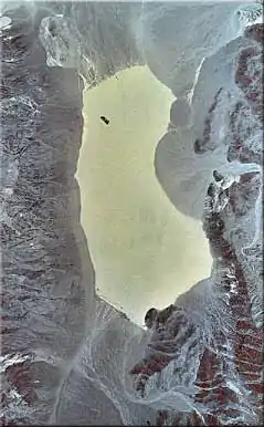 ![]() Vista de satélite de Racetrack Playa, con la cordillera Last Chance, a la izquierda, y las montañas Cottonwood, a la derecha. En el extremo norte se ve la gran isla The Grandstand | ||