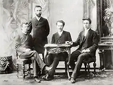 Antón Arenski (sentado en el centro) con sus alumnos (desde la izquierda): Lev Conus, Nikita Morózov y Serguéi Rajmáninov (1892)