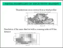 Sin embargo, las gotas de lluvia están cayendo. Como el radar ve solo la componente radial y tiene una cierta elevación del suelo, las velocidades radiales se contaminarán por alguna fracción de la velocidad de caída. Afortunadamente, este componente es insignificante en ángulos de elevación pequeños, pero debe ser tenido en cuenta para ángulos de escaneo más altos.[9]