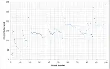- Radio de Van der Waals: en principio, la mitad de la distancia mínima entre los núcleos de dos átomos del elemento que no están vinculados a la misma molécula.[7]