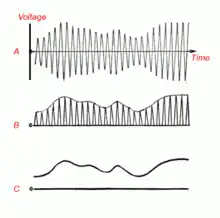 (A) Señal de radio de amplitud modulada del circuito sintonizador. Las oscilaciones rápidas son las de la onda portadora de radiofrecuencia. La señal de audio (el sonido) está contenida en las variaciones lentas (modulación) de la amplitud (la altura) de las ondas portadoras. Esta señal no se puede convertir directamente en sonido a través del auricular, debido a que las fluctuaciones de la onda de audio son prácticamante las mismas en ambos lados del eje, con un promedio que tiende a cero, lo que daría lugar a un movimiento neto NULO del diafragma del auricular. (B) El cristal de galena conduce la corriente mejor en una dirección que en la otra, produciendo una señal cuya amplitud no promedia cero, sino que fluctúa de acuerdo con la señal de audio. (C) Un condensador en derivación (o la propia capacitancia del circuito en su defecto) se utiliza para eliminar los pulsos de la onda de radiofrecuencia portadora, dejando separada la señal de audio.
